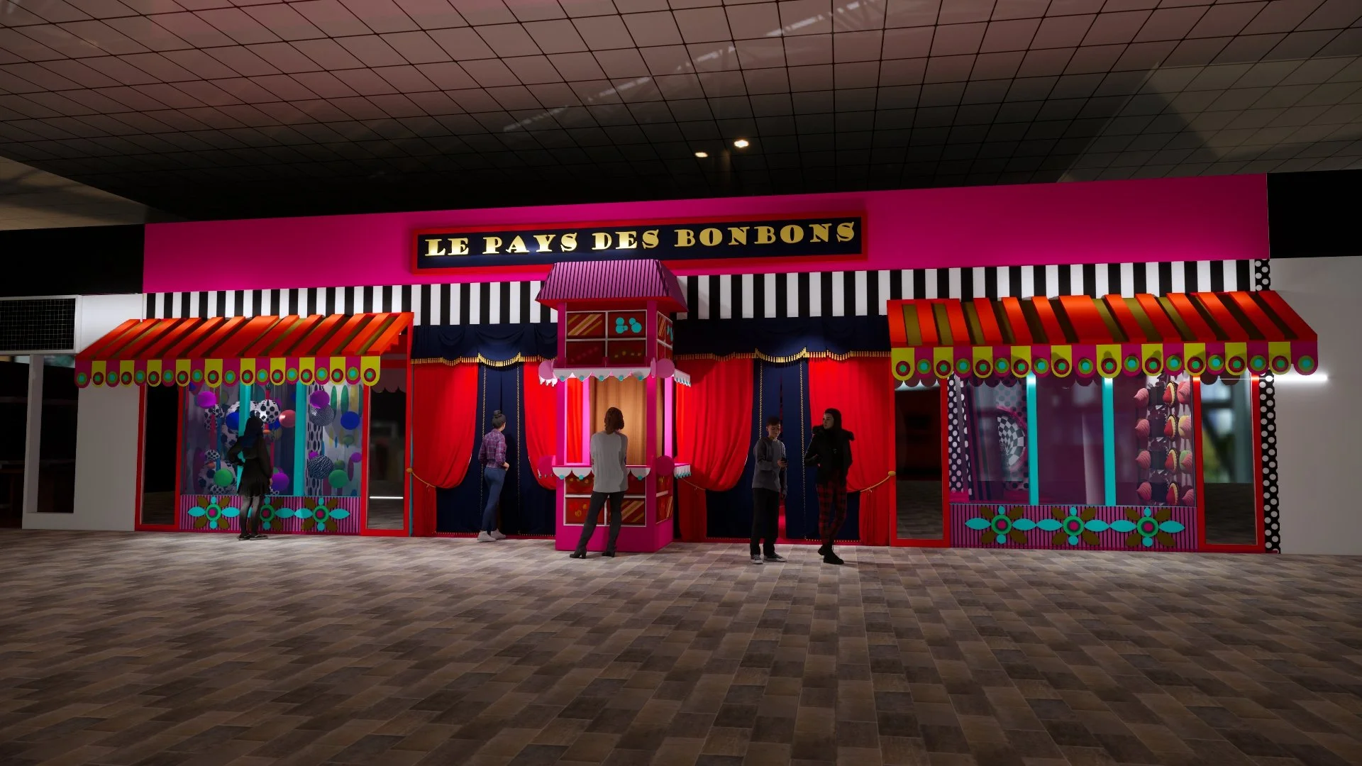 Candyland is a fantastic, sugar-coated adventure designed for children 8-12. Meant to be installed in an empty mall space, this immersive experience invites kids to follow a playful route winding through themed zones, interactive games, and sweet surprises. At the heart of the space is a lively central area—a giant ball pit surrounded by trampolines and swirling fans, bringing energy and excitement to every step of the journey.