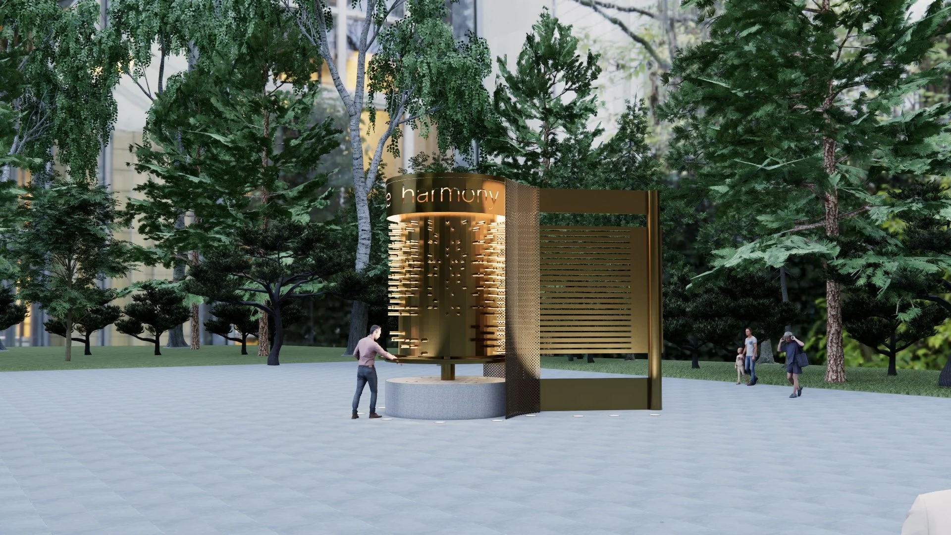 Harmony is a monumental, sculptural music box proposed for the Google campus in Bangalore, India. Crafted from brass and aluminum on a concrete base, its gleaming surfaces and classic mechanism blends precision engineering with poetic imagination. This kinetic installation is brought to life through human interaction—visitors activate the piece, setting it in motion and triggering a rich, layered composition. As it turns, Harmony merges mechanical movement with melodic rhythm, creating a multisensory experience. A reflection on collaboration, technology, and play, the installation invites people to pause, participate, and share in a moment of resonance at the heart of a digital environment.